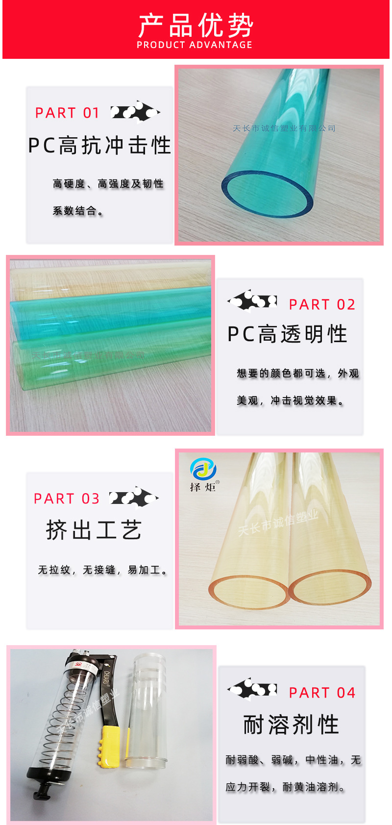 公司經過長期以來的生產實踐和創新完善,選用進口原材料,使用新型大型生產設備生產的高透明度PC管/型材系列產品,更好的滿足了國內外客戶的高品質要求,深受國內外市場歡迎和好評。